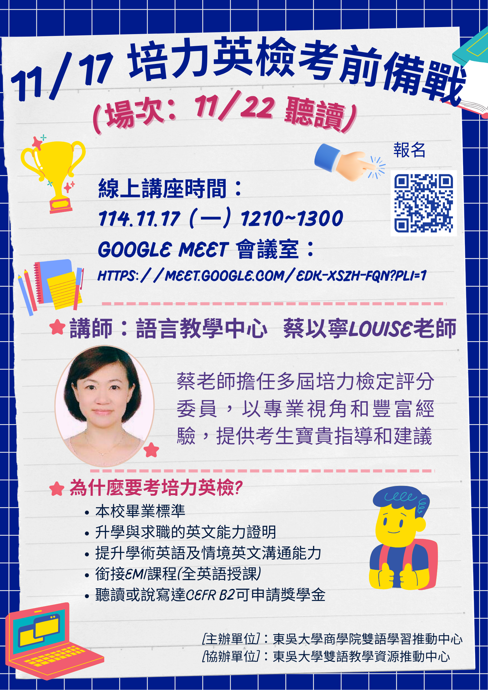蔡以寧老師擔任多屆培力英檢評分委員,可以專業角度及豐富經驗,提供大家寶貴的指導與建議,機會難得,不要錯過喔!!