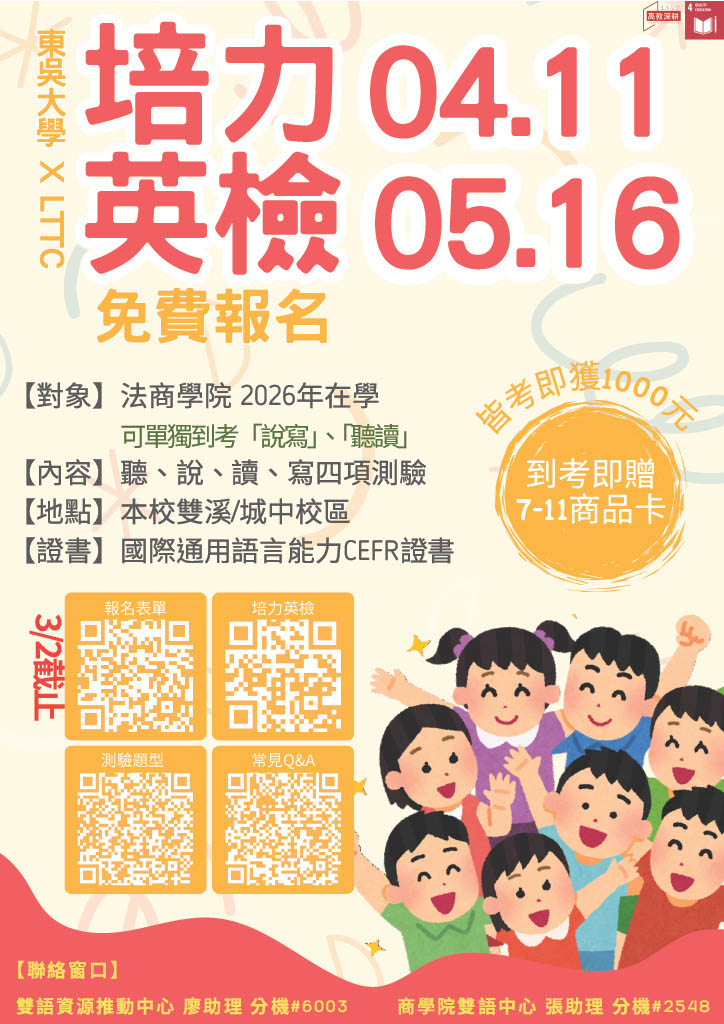 114-2 學年度「培力英檢」即日起開放免費報名,歡迎商法學院同學把握機會參加,為自己多累積一項實力與履歷亮點。